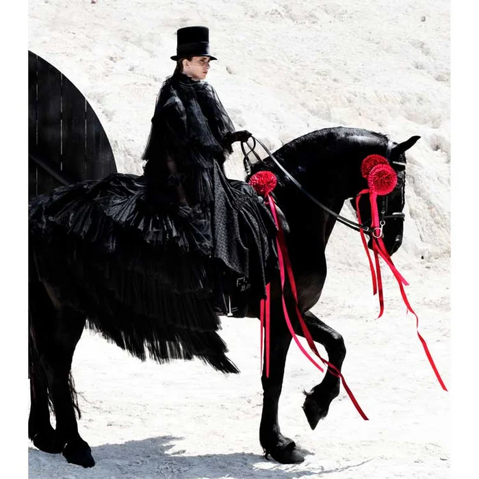 Das Zusammenspiel zwischen der Emanzipation der Frau und der Kleidung wird perfekt durch die Geschichte desReitkostümsverkörpert,in dem überdauernden gesellschaftlichen Regeln auf subtile Weise zu neuen Perspektiven überredet wurden - ein Teil der Geschichte von Creed, der Olivier Creed bei der Kreation von Aventus for Her als Inspiration diente. Um diesen außergewöhnlichen Aspekt der Creed-Vergangenheit zu feiern, haben wir die Designer Cunnington & Sanderson gebeten, Elemente aus den Reiterkostümen der Vergangenheit aufzugreifen und sie als Inspiration für ihre eigenen modernen, dekonstruierten Kreationen zu verwenden. Die daraus resultierenden starken, eleganten und unverkennbar femininen Silhouetten sind außergewöhnlich. Fachmännisch gefertigte Reitbekleidung geht nahtlos in gewagte Couture-Kleidung über. Das Schwarz-Weiß des Kostüms Amazone wird originalgetreu aufgegriffen, aber mit einem Hauch von Militärrot aufgewertet. Es ist unmöglich, sich nicht vorzustellen, dass es die Zustimmung der unbezähmbaren Kaiserin Eugenie finden würde.